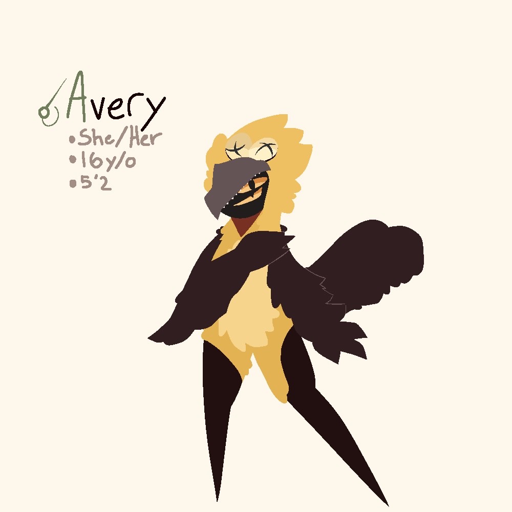 Avery is a scrawny, enigmatic creature wearing a fursuit. Her costume is an Archeopteryx, with a yellow body and head, a lighter belly, purple arms and tail, with black cone legs. Her face is a black sphere with amber eyes and mouth. We don't see any other part of her body, besides possibly her legs. Her costume is finished with a grey beak above her head, with two yellowish-green googly eyes, with X-shaped pupils.