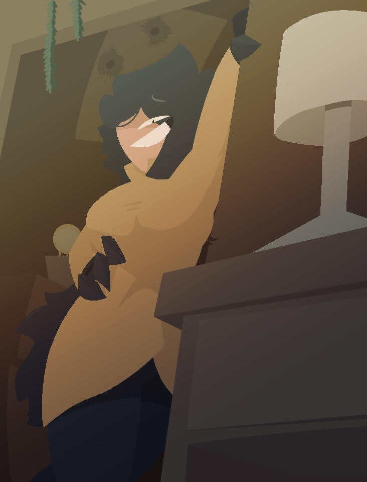 Layla is a curvy woman in her early 20s. She wears a tight, light-brown trench coat that goes down to her thigh. Her legs are navy blue, with hoove-esque feet. Her navy blue hair is brushed to the sides away from her face, and go up in messy tufts. Her hair extends down to her waist. Layla only has her left eye, with a slit pupil, with sharp white teeth.