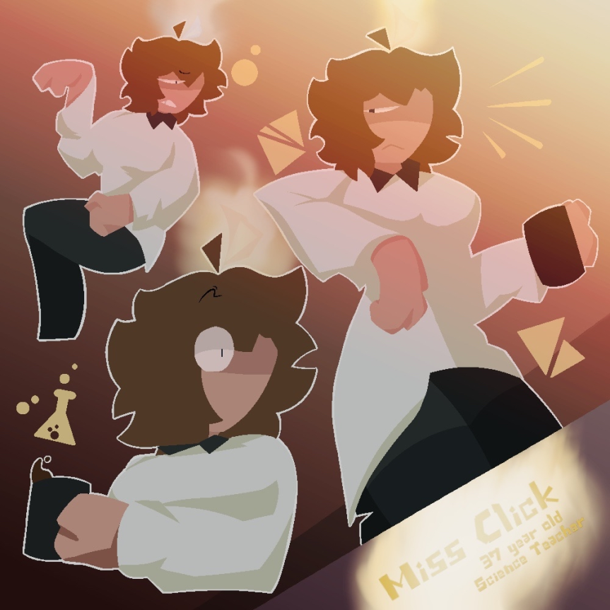 Miss Click is a tall, attractive high school teacher. She has tufty, shoulder-length, brown hair with a thick ahoge down the middle of her face and a brown cowlick. Her second cowlick is a small flame, signifying her mood. She wears a basic thigh-length white lab coat with a black collar. She wears tight black yoga pants. Similar to Layla, she has hoove-like feet with high heels.